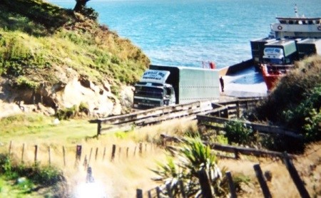 Neville Brothers truck stock on to the island. Sometimes the trucks had to be towed around the tight bend above the ramp. (click on photo to enlarge) Cattle and sheep about to be off loaded. Note the dogs waiting. (click on photo to enlarge) Ronnie and Terry also ran the kiosk. For the full story of Ronnie’s experiences on Motuihe click here. |